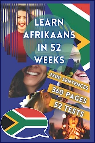 This text is organized into 52 weeks, and each week had a number of phrases for you to learn in Afrikaans. Each week also has a test to reinforce your learning. Each phrase has an English translation underneath, and by the end of a year, the text boasts that you will have learned over 2500 useful Afrikaans sentences.